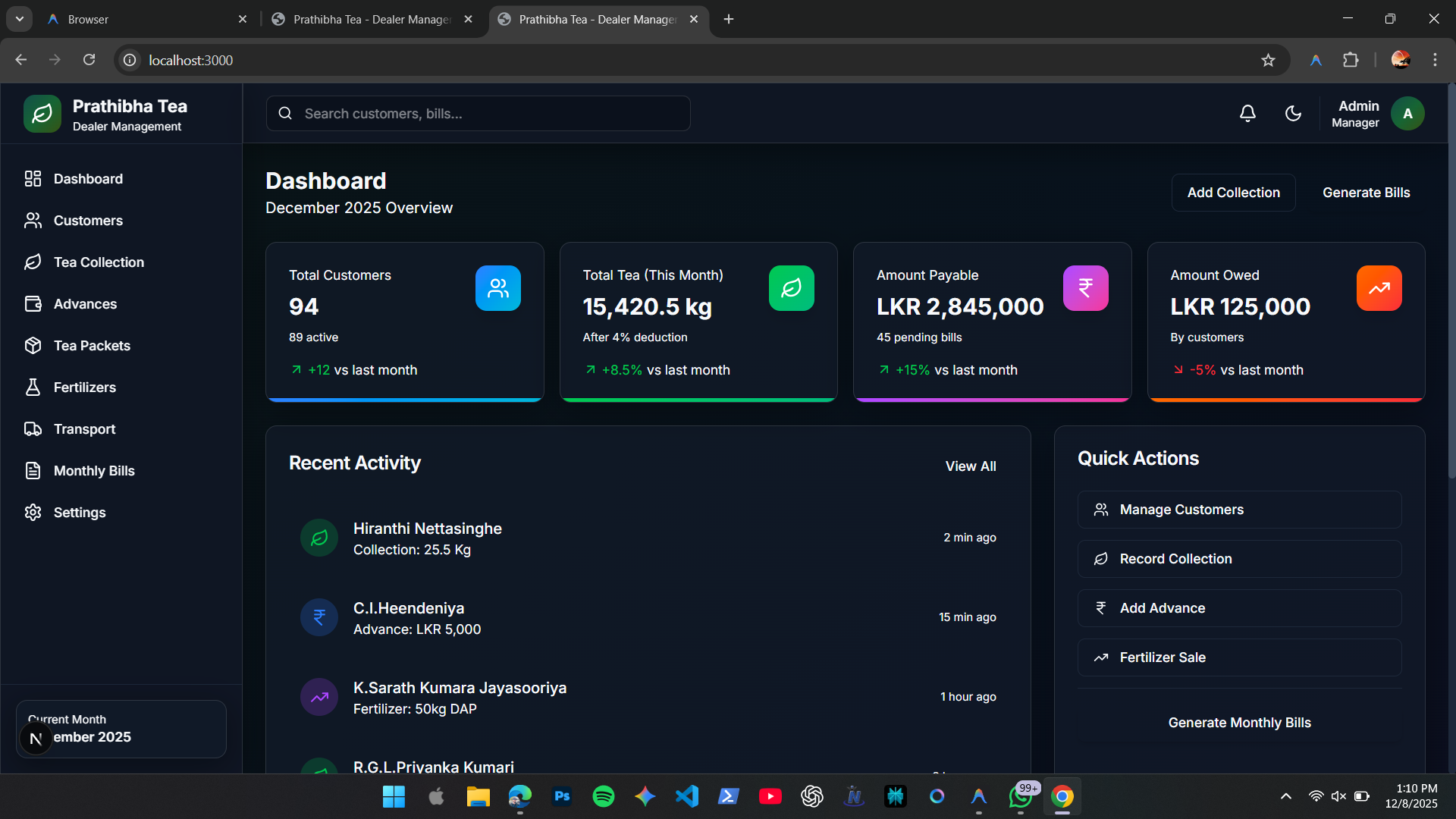 IndividualA comprehensive management suite for tea dealers featuring role-based access, automated billing with print support, real-time analytics, and fertilizer installment tracking.